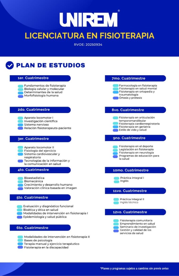 Formar profesionales altamente capacitados en el campo de la fisioterapia, destacados por su excelencia académica, conocimientos especializados y habilidades prácticas. Como universidad comprometida con la formación integral, proporcionamos a nuestros estudiantes los conocimientos teóricos y prácticos necesarios para evaluar, diagnosticar y tratar de manera efectiva a pacientes con diversas afecciones y condiciones de salud. A través de la utilización de tecnología de vanguardia, formamos a nuestros estudiantes con las herramientas y recursos necesarios para potenciar su aprendizaje y prepararlos para enfrentar los desafíos en el campo de la fisioterapia.